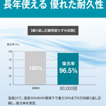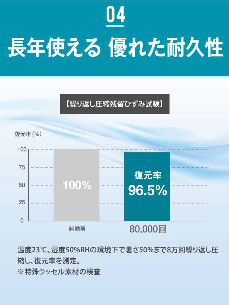 8万回の圧縮試験後も復元率96%以上を保持。長期間使用してもヘタリにくく、しっかりした寝心地が続きます。