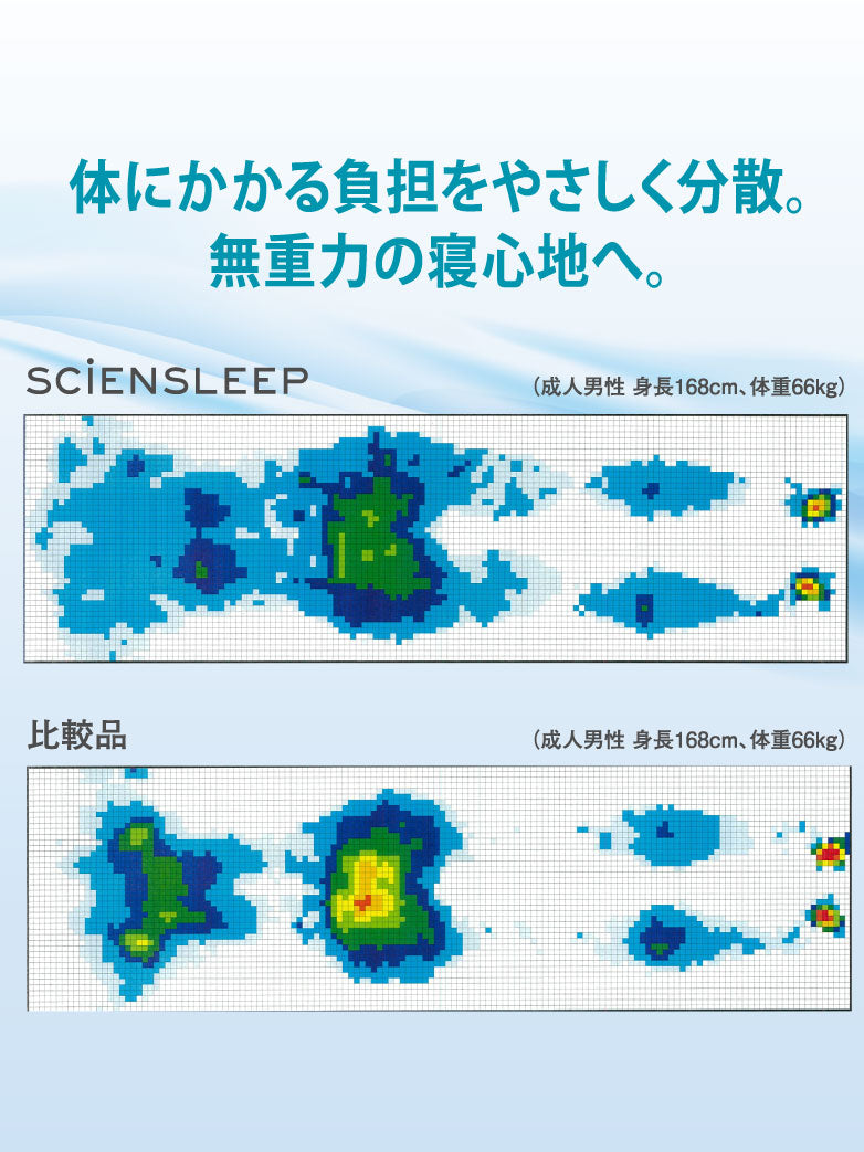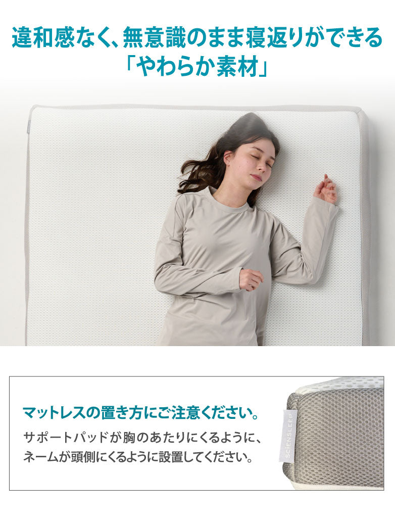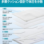 4層のソフト立体構造と、腰部を支えるハード構造を組み合わせた多層設計。肩や腰などの負担を分散し、自然な寝姿勢を保ちます。