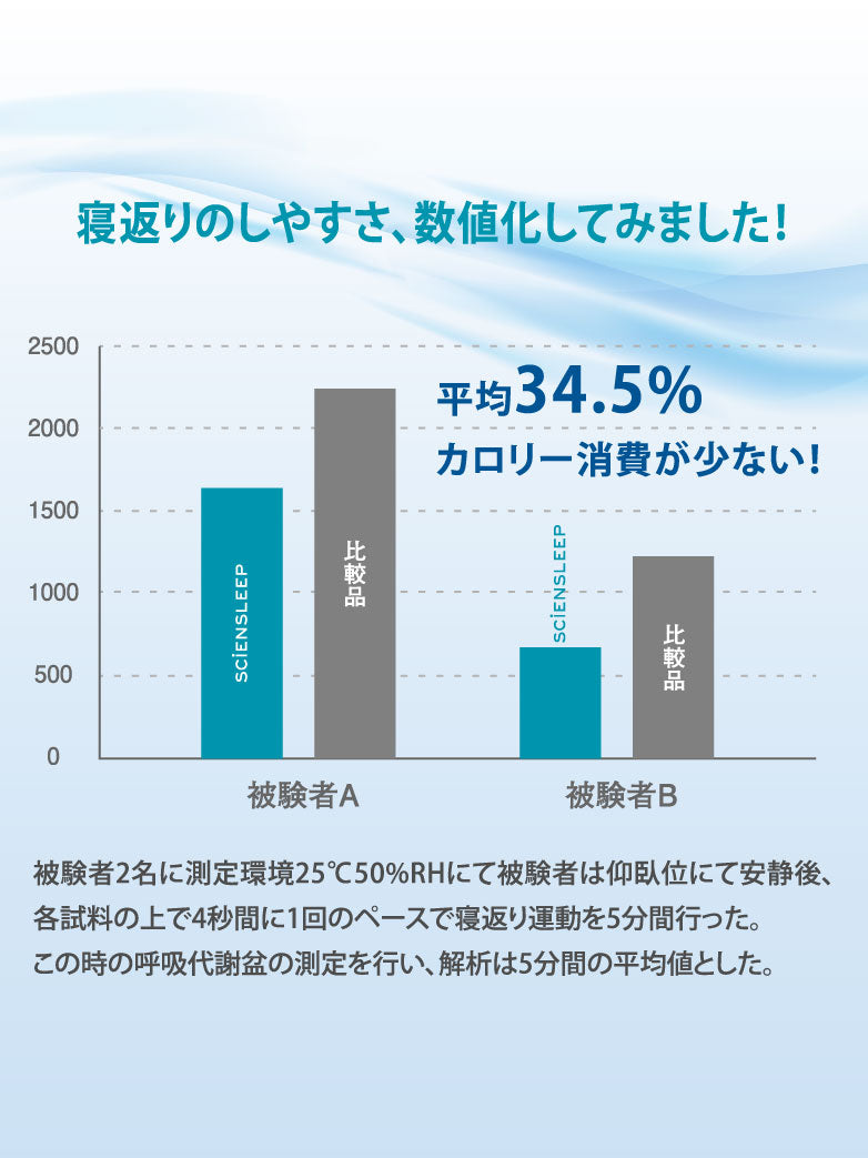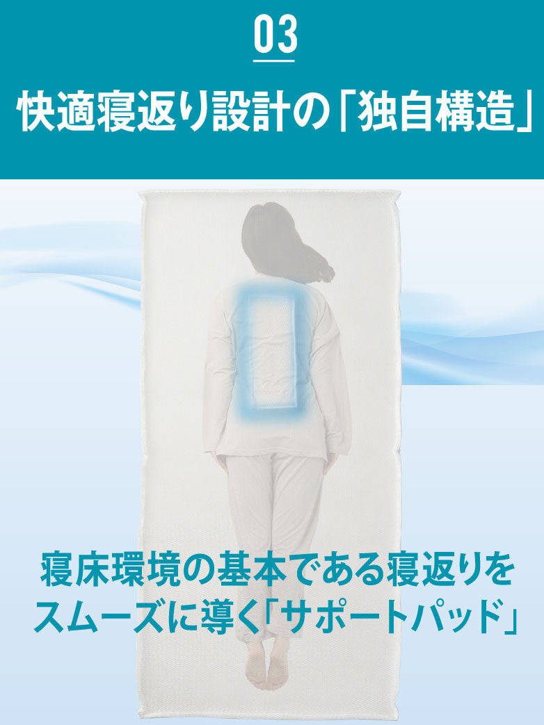 寝返りをスムーズに促す特殊パッドを配置。スッと転がるように動けるので、血流を妨げず、深い眠りをサポートします。